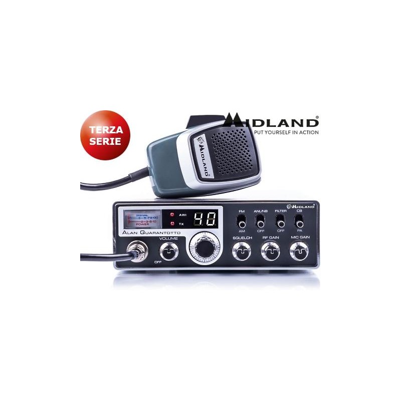 Midland Alan Quarantotto, radio CB, 40 canali AM/FM, potenza 4Watt, display LED canali, regolazione volume + squelch + MIC Gain + RF Gain, filtri FIL/ANL, selettore canali a rotazione, staffa auto, alim. 13,8Vcc. Dim. (LxHxP) 166x55x182 mm.