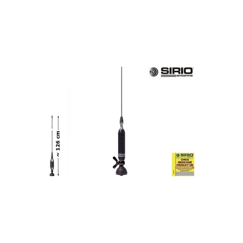 Sirio Titanium 1200 NE, antenna CB (27÷28.5 Mhz tarabile), base per fissaggio su foro Ø 12,5 mm, stelo in acciaio inox inclinabile di 180°, altezza ±1220 mm, potenza 20W (200W di picco), ROS ≤ 1.2, cavo da 4,0 m. con connettore. Antenna asportabile