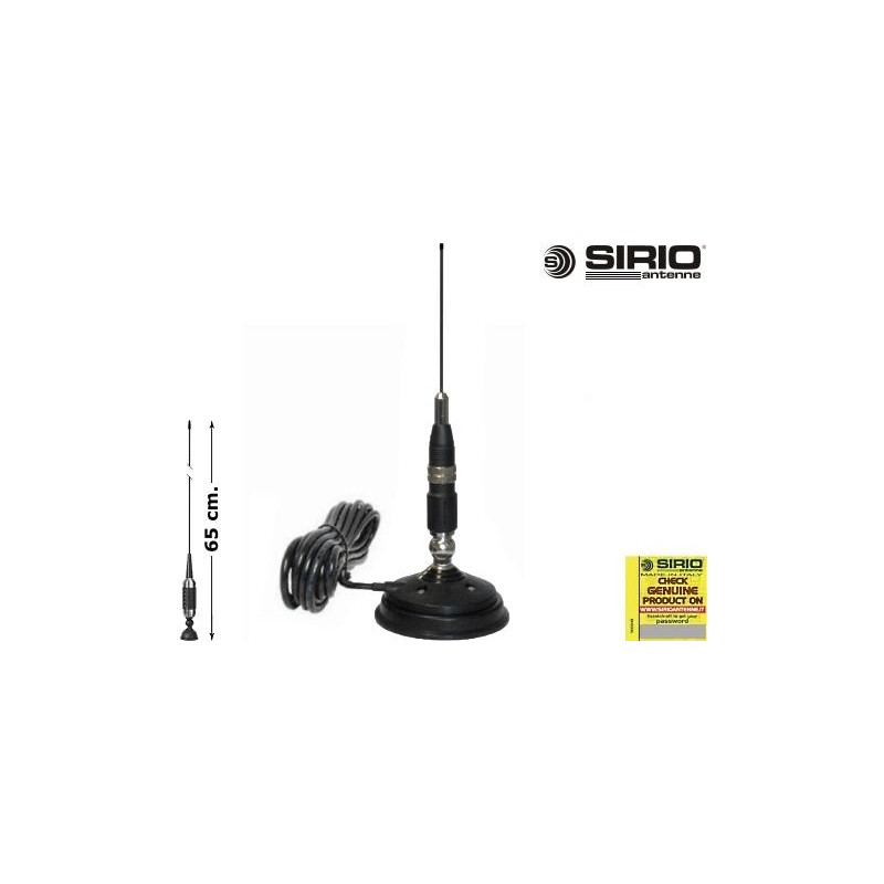 Sirio Mini Snake 27 MAG, antenna CB (26.5÷27.4 Mhz tarabile), base magnetica da 100 mm, stelo in acciaio inox inclinabile di 180°, altezza ±650 mm, potenza 10W (40W di picco), ROS ≤ 1.2, cavo da 3,6 m. con connettore. Set di sicurezza a corredo.