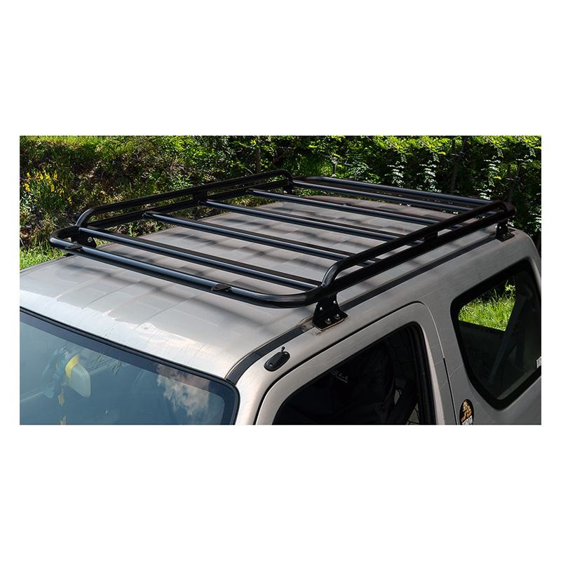 Realizzato in tubo d.35×2 con traverse centrali in ovale 50×25 il portapacchi per Suzuki Jimny si presenta verniciato a polvere nera, previo trattamento di sabbiatura superficiale; struttura di estrema robustezza e solidità.