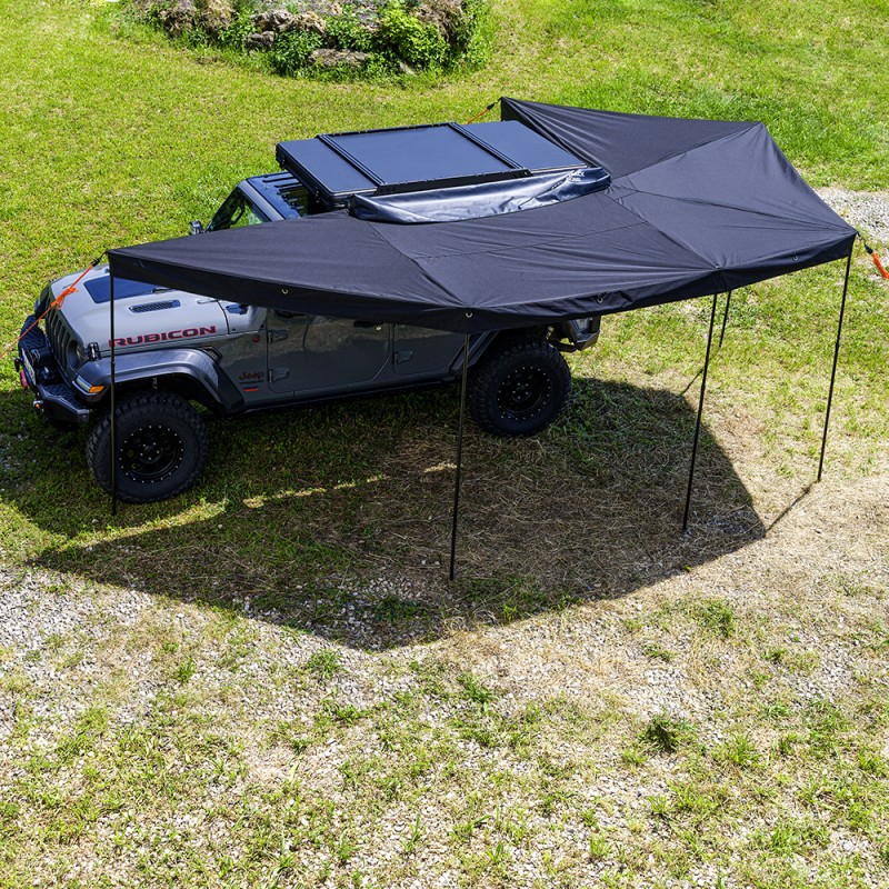 L'elegante tendalino in alluminio grigio è la compagna perfetta per chi non vuole rinunciare al comfort in viaggio. Grazie al suo ampio angolo di apertura a 360 gradi, offre un'ampia protezione dal sole e dalla pioggia intorno al veicolo, ideale per viaggi fuori porta, campeggio o uso mobile nella natura.