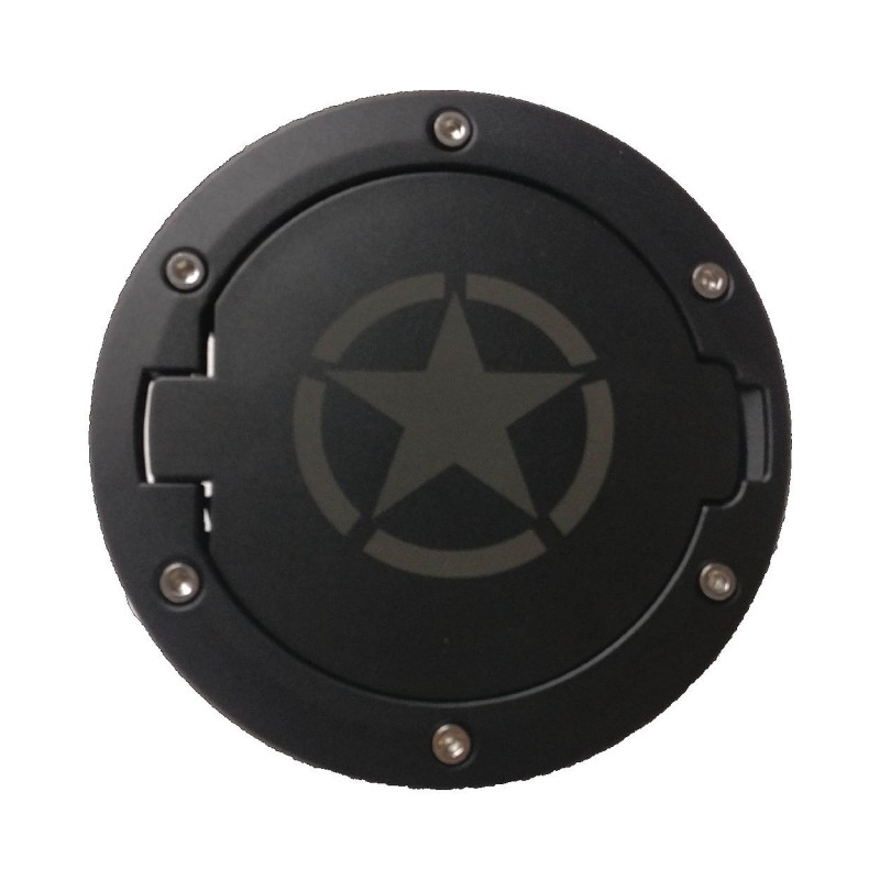 Tappo carburante nero per Jeep Wrangler JK. Coperchio in alluminio sagomato con stampa stella.