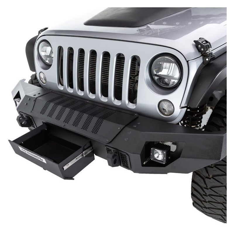 Paraurti anteriore pronto per il verricello Trailline con tappi terminali dritti e grilli brevettati a gancio di rinoceronte. Il paraurti ha un cassetto porta attrezzi con chiusura che può essere sostituita con serratura opzionale. Sono disponibili anche 3 supporti per barra luminosa opzionali.